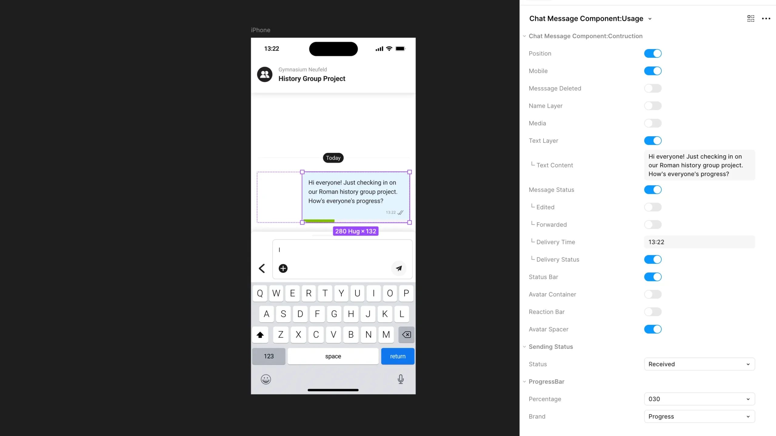 Through a single master component and its variants, all message types — from simple text bubbles to grouped or reacted messages — can be displayed seamlessly.