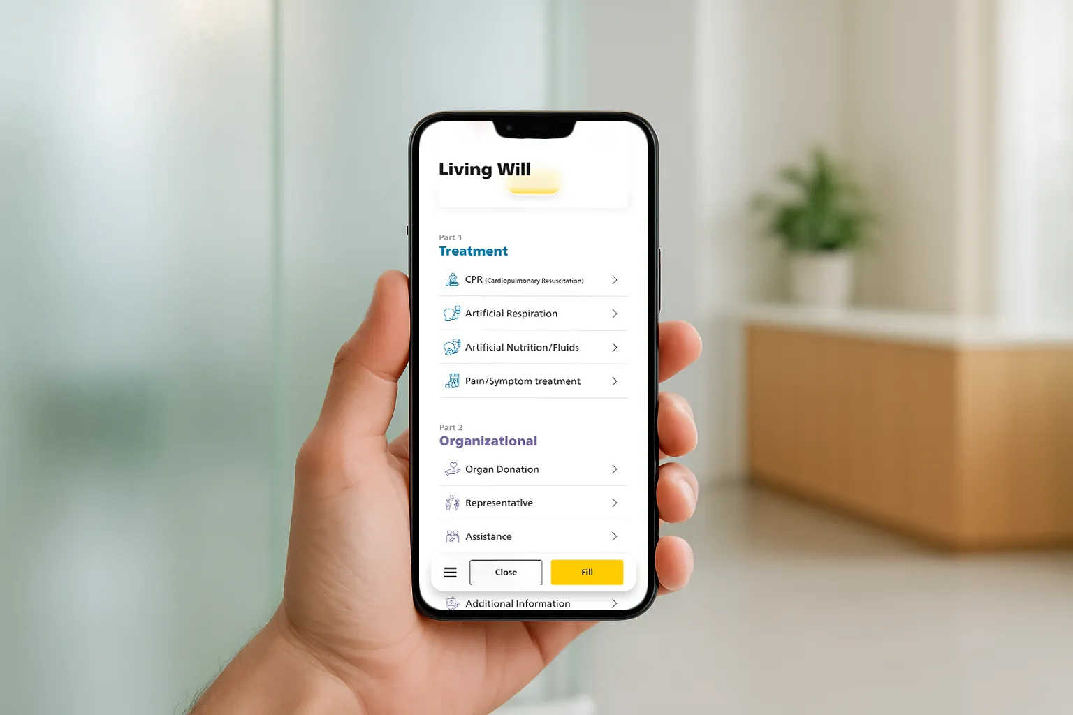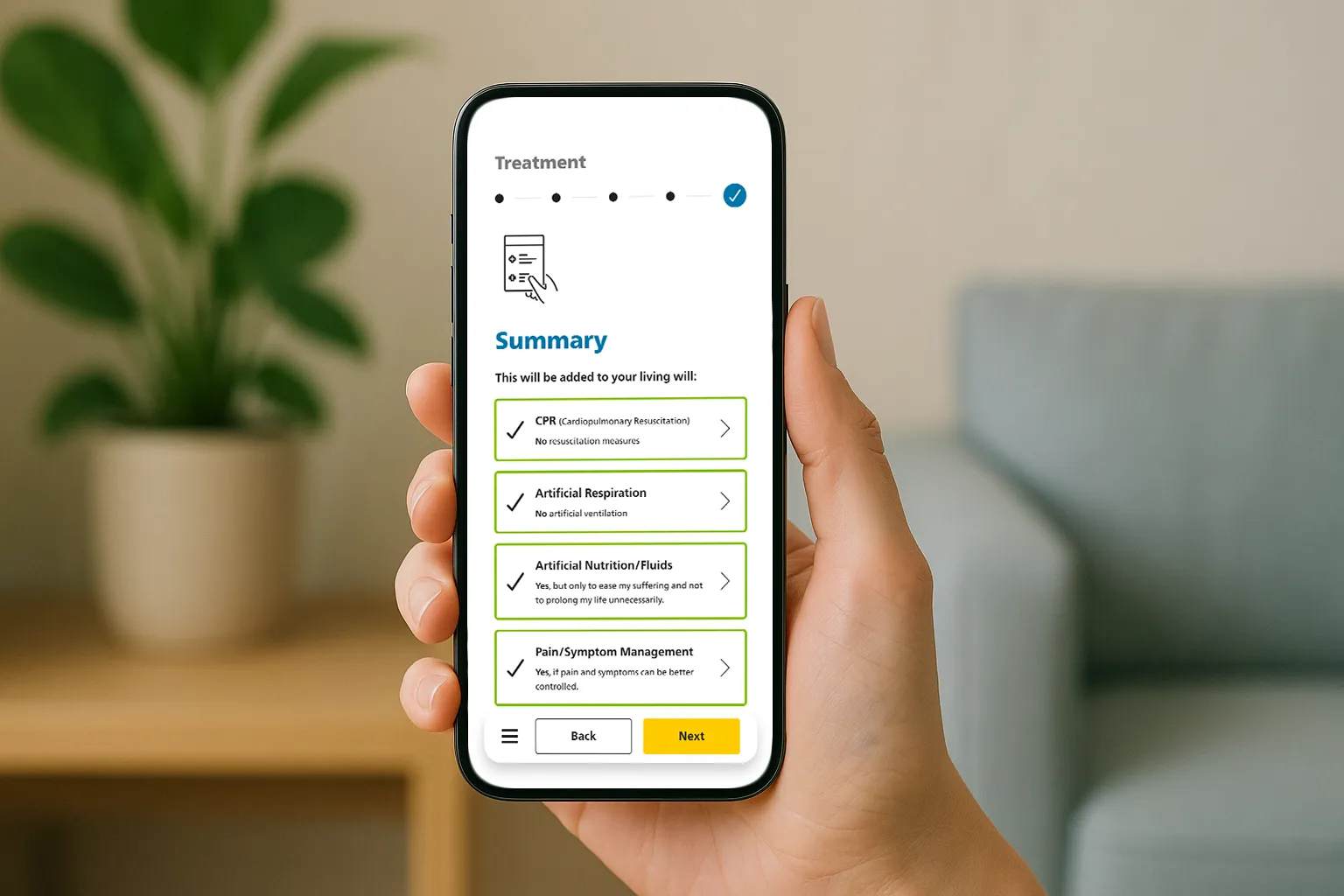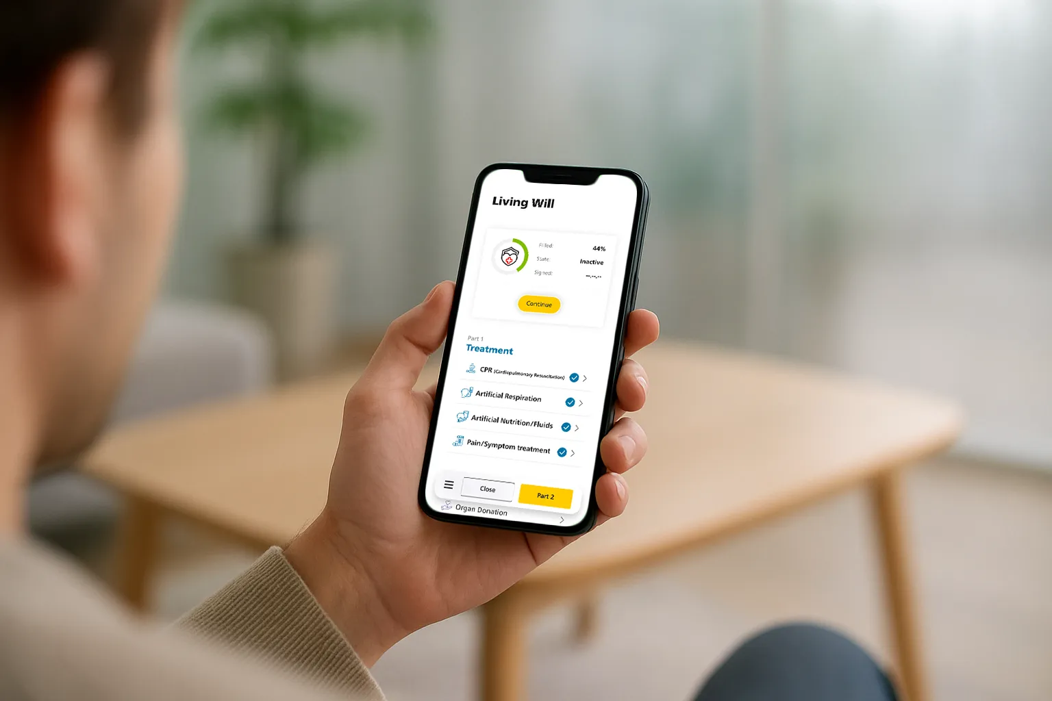 Save/Resume: Autosave on each decision; “Continue Living Will” entry on app health overview.