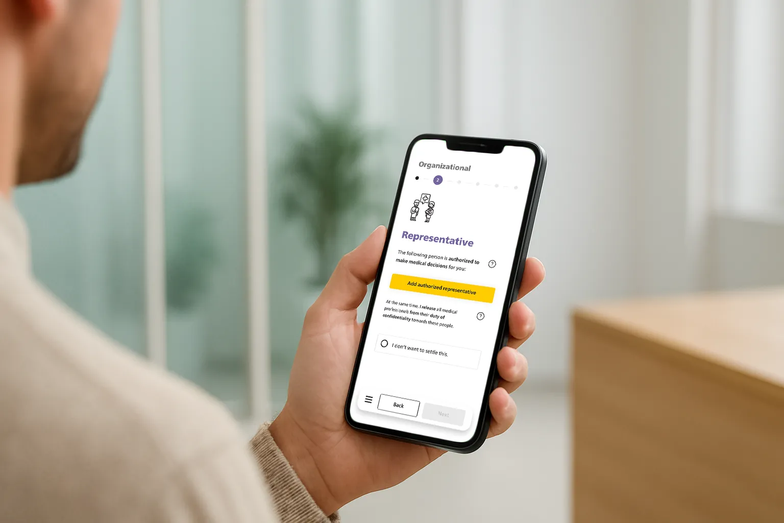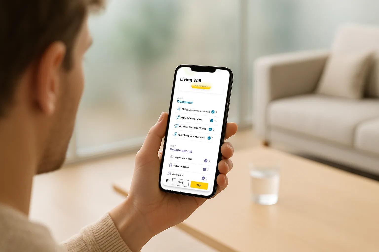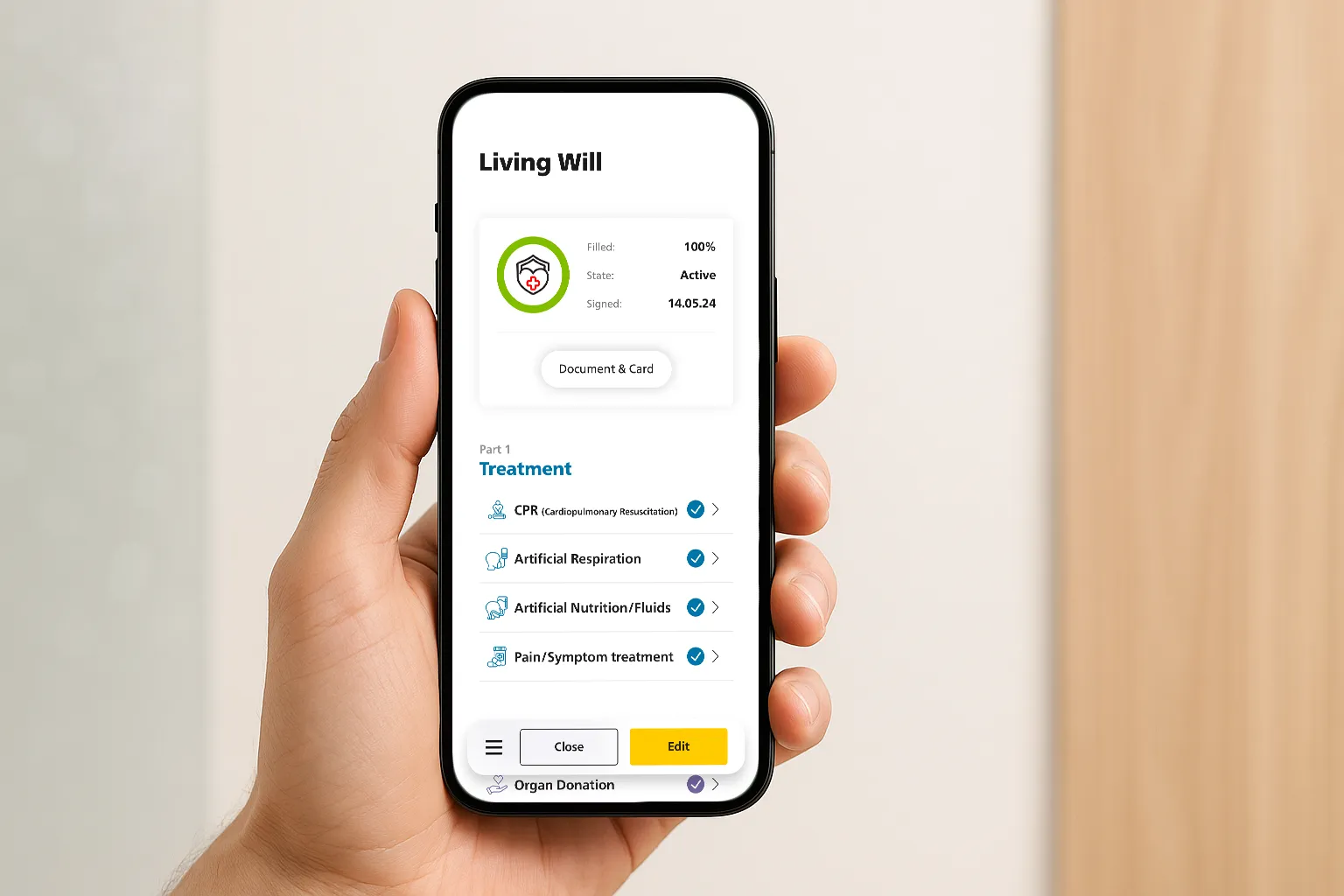 Save/Resume: Autosave on each decision; “Continue Living Will” entry on app health overview.